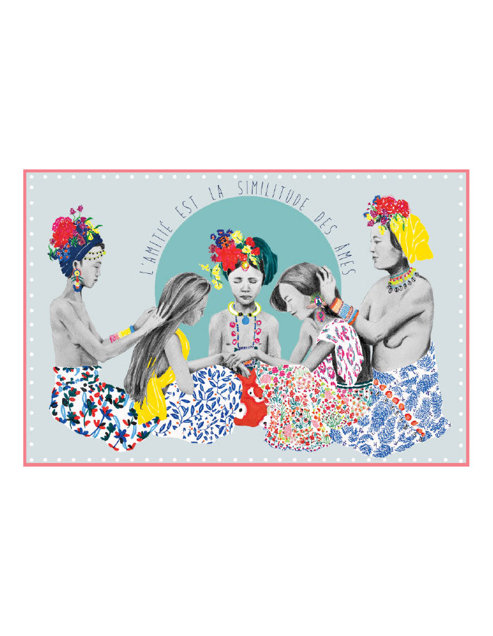 La carte de papeterie Cinta apportera paix, couleurs et gentillesse. Cette illustration, à l'origine dessinée à la main avec des crayons et stylos japonais, raconte l'amour inconditionnel entre mère et fille mais aussi la relation entre les femmes dans un village indonésien.