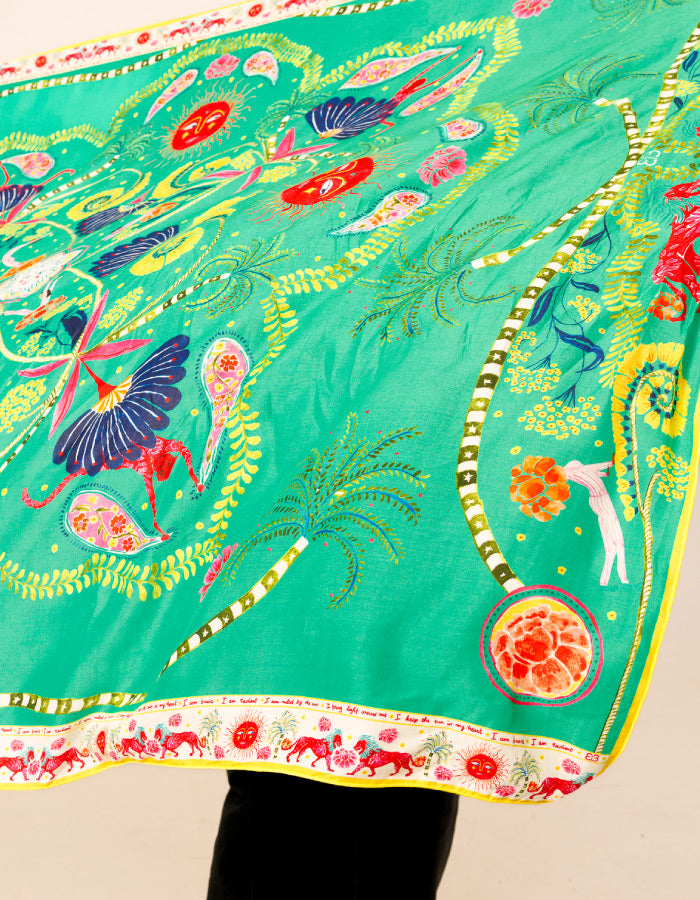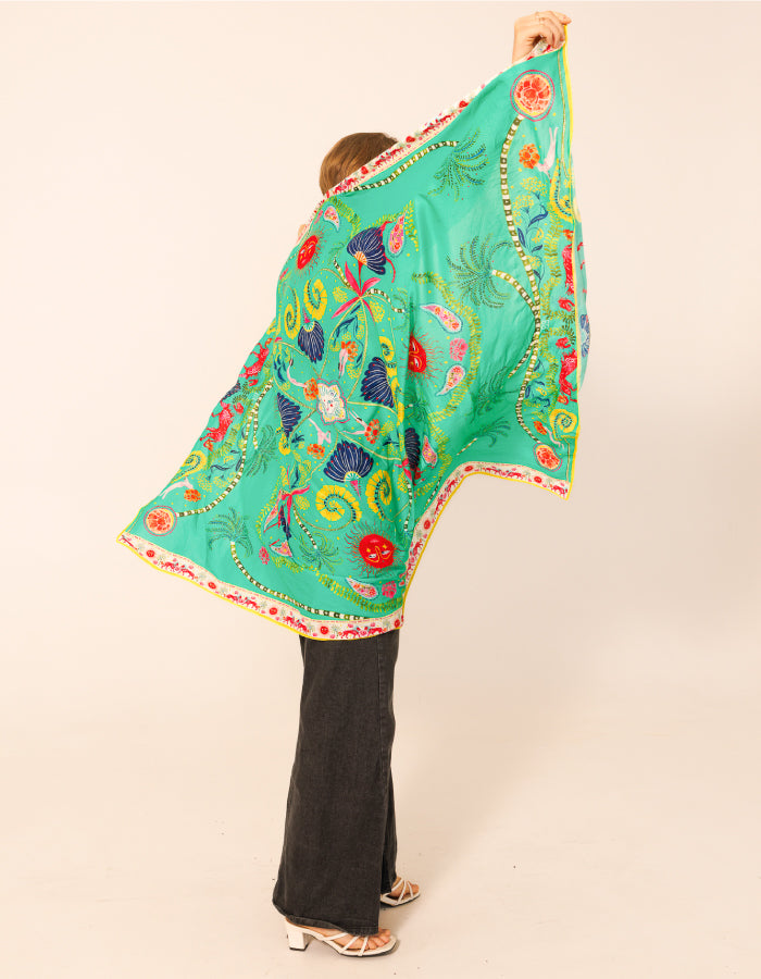 Bien plus qu’un paréo, c'est une véritable œuvre d’art à porter ou à exposer. Il se transforme en paréo, robe ou écharpe légère. Chez vous, il devient un tableau encadré, une tenture murale, une nappe ou un couvre-lit.
