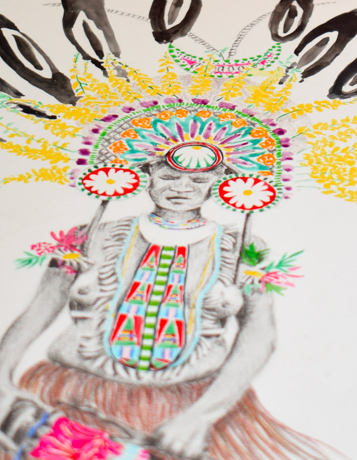 Batari means «goddess» in Indonesian and represents a powerful woman from a lost tribe in New Guinea: the Asmats. Her hand-carved wooden drum transports us to a real incursion into the Neolithic period. The high feathers that adorn her emanate something supreme, sovereign from her.