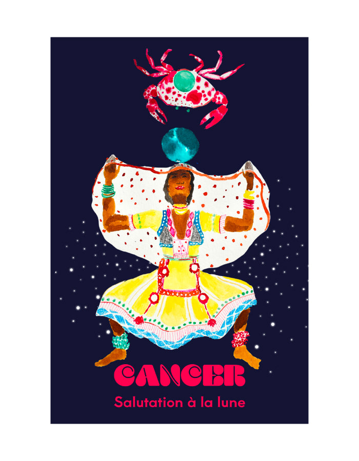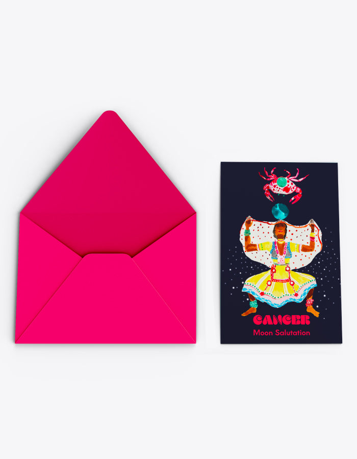 Celebrate the bold spirit of Cancer with this daring greeting card featuring a dynamic moon salutation pose inspired by an Indian dancer from Rajasthan. The intricate crab emblem blends tradition and power, making your message truly unforgettable. Perfect for those who embrace strength and emotion with fearless grace.