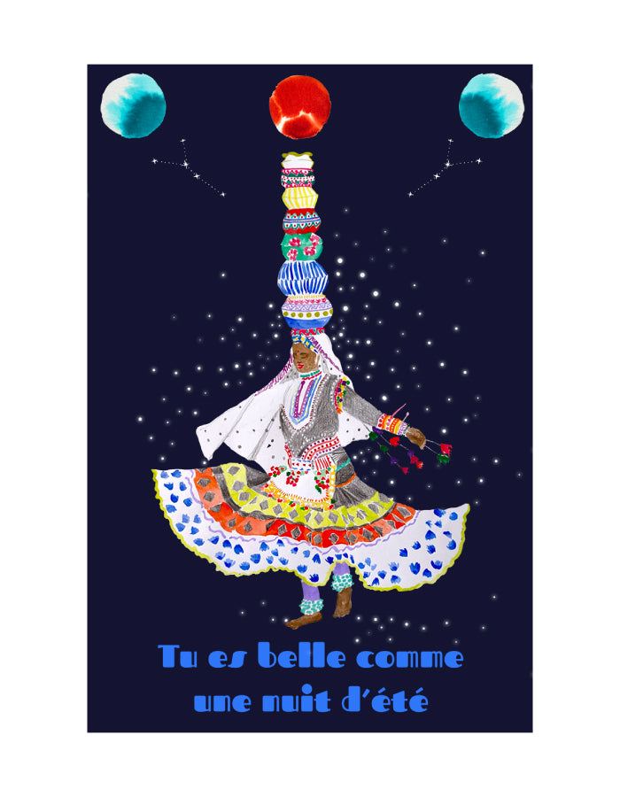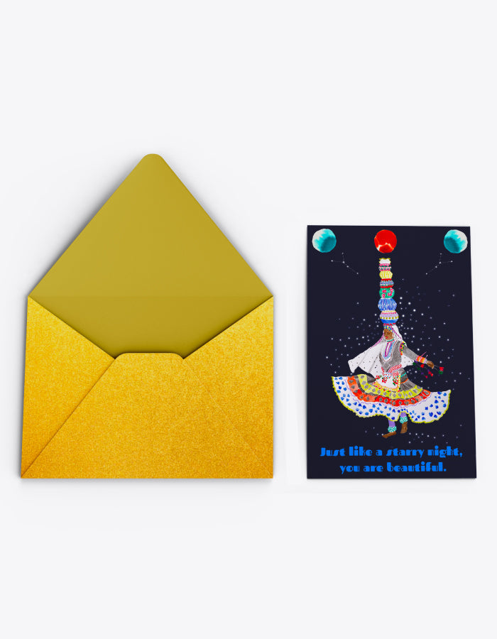 Brighten someone's day with this card, inspired by the twirling grace of a Rajasthani dancer and the sparkle of a starry night. Just like those shimmering skies, this playful card reminds you that you’re truly beautiful and magic is all around!
