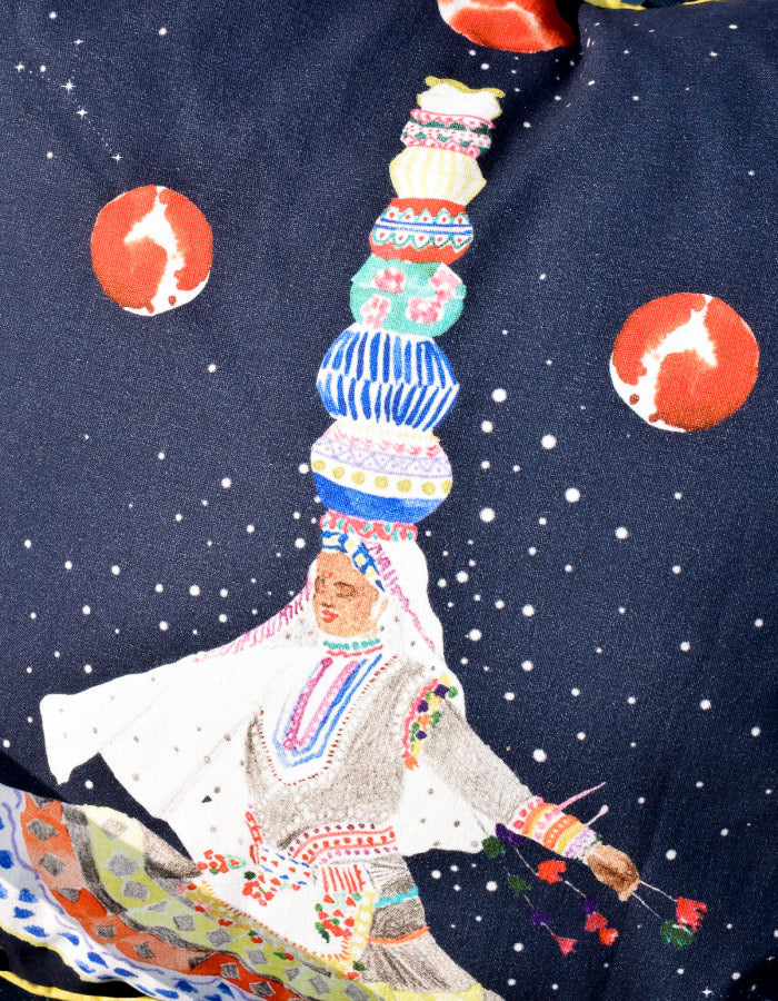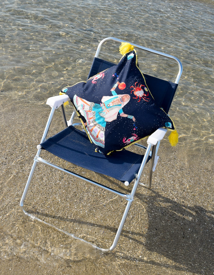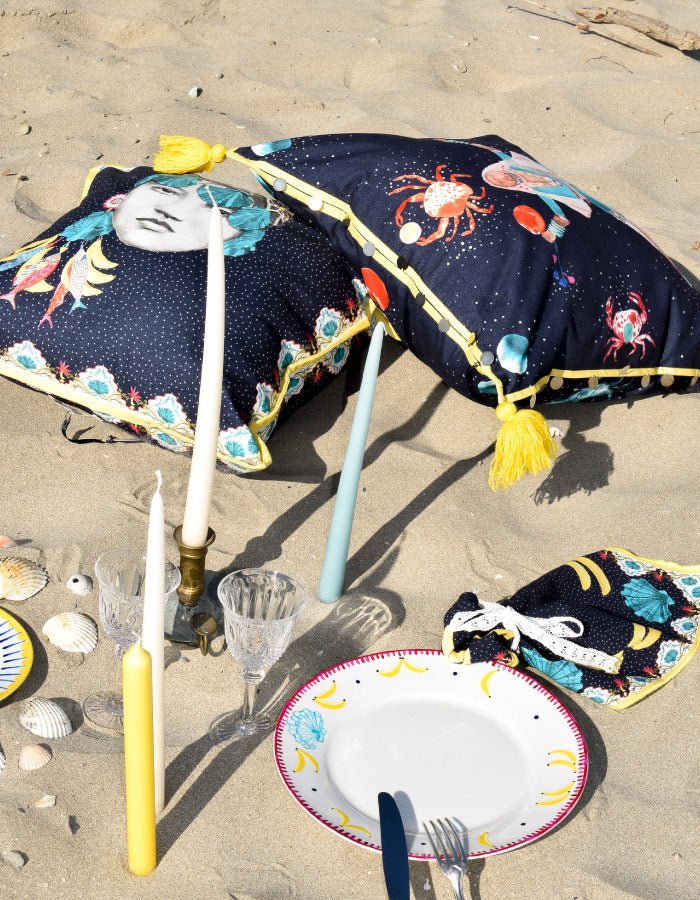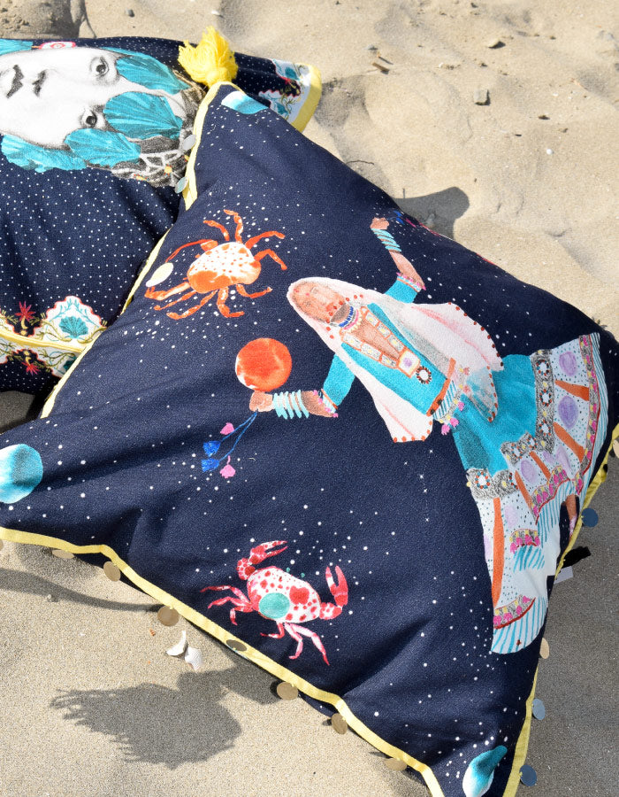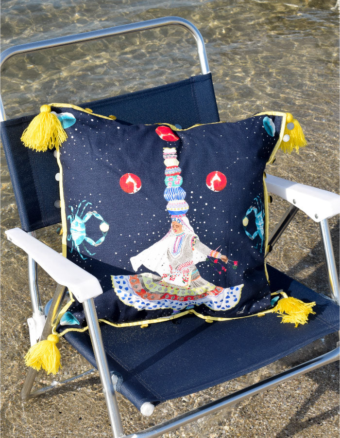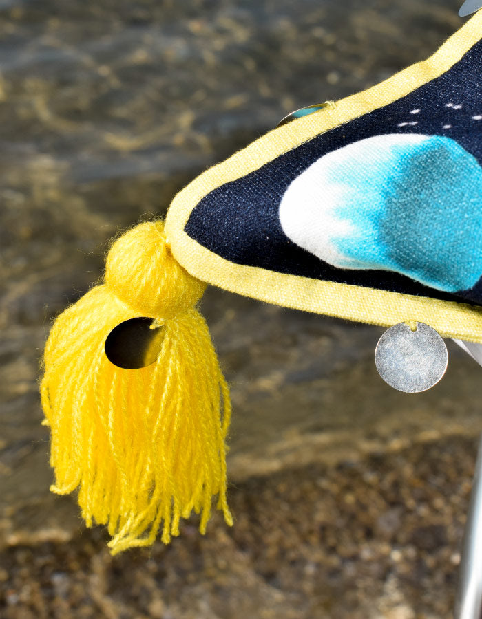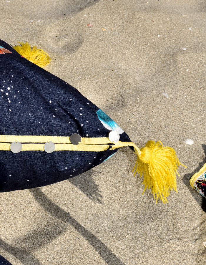 Add a splash of fun with the Chandra Pillow Case, adorned with cheerful yellow woolen tassels handcrafted for a lively touch. Silver sequins dance across the fabric, inspired by the colorful flair of Rajasthani dancers. This playful design brightens any room with energy and charm, perfect for those who love a joyful pop of style.