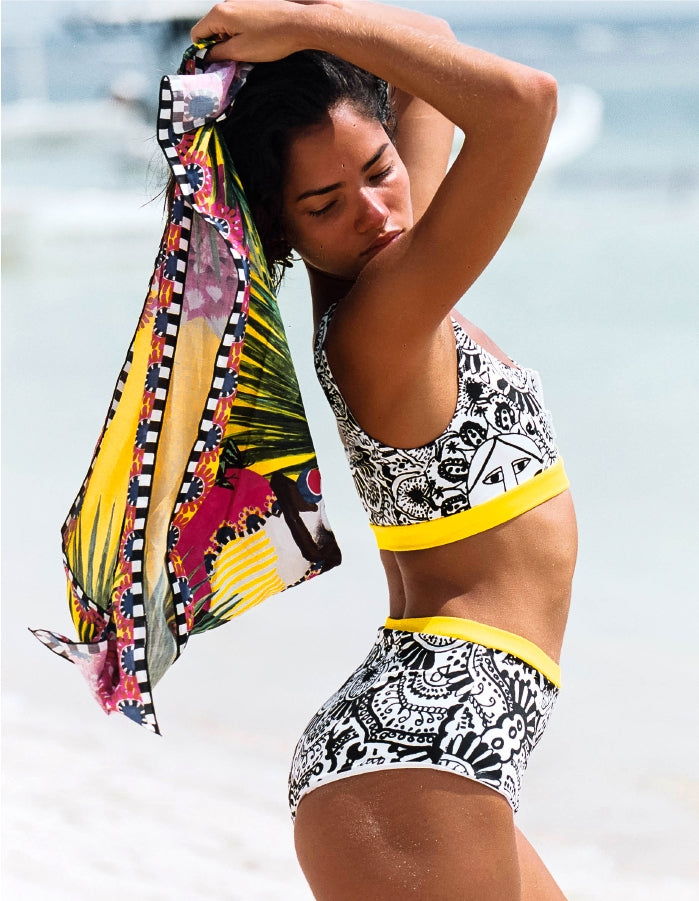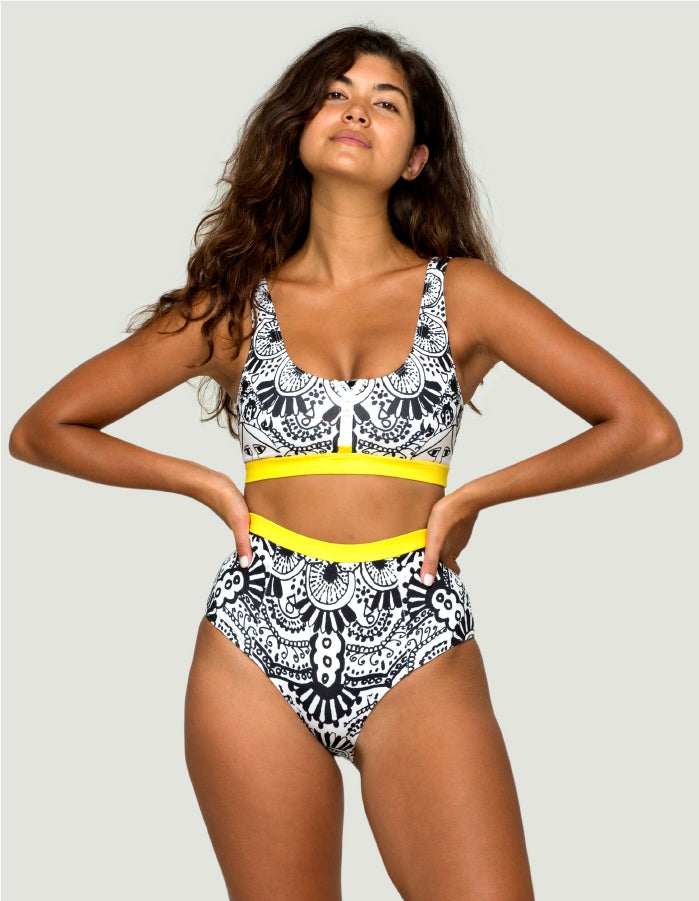 This bikini top with front zip has an elastic band under the chest for better support and is lightly push up. It looks great half-zipped by the pool or all the way zipped for swimming, running on the beach, surfing or even for yoga. We are always complaining that our tops are coming down when we do water activities, so we made something that stays on while still looking super hot!