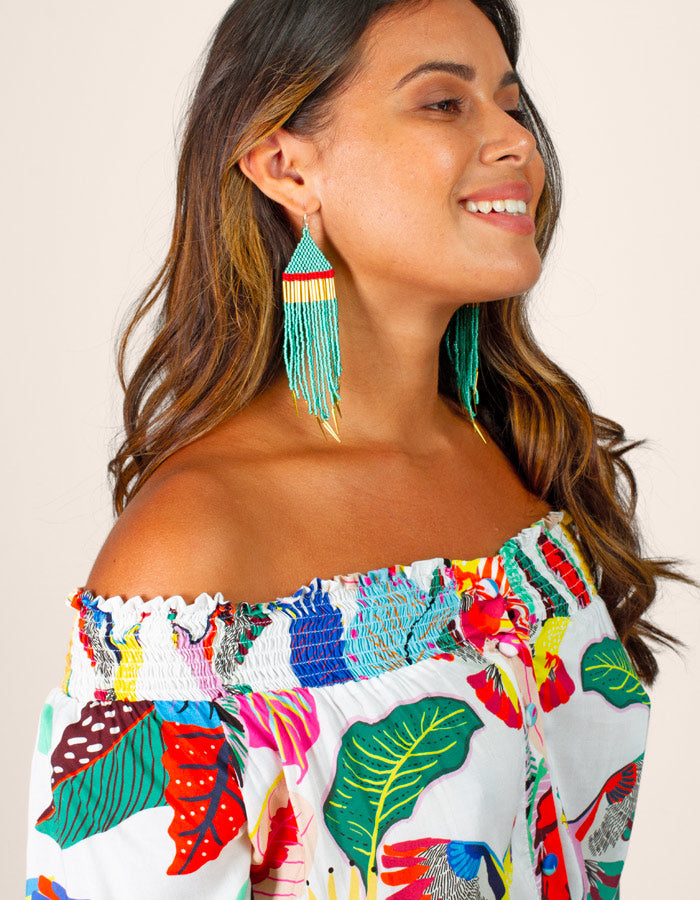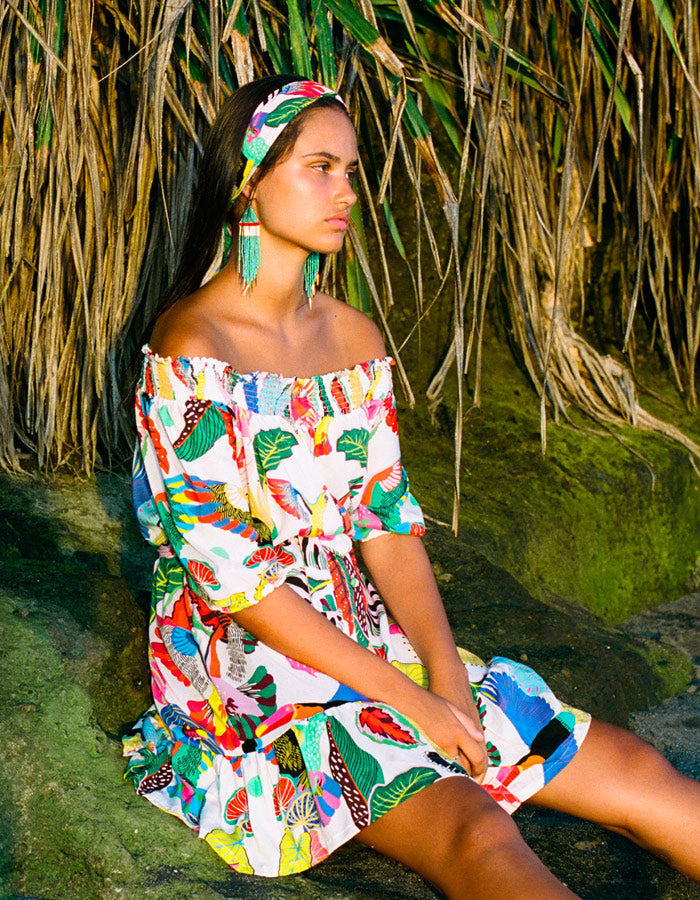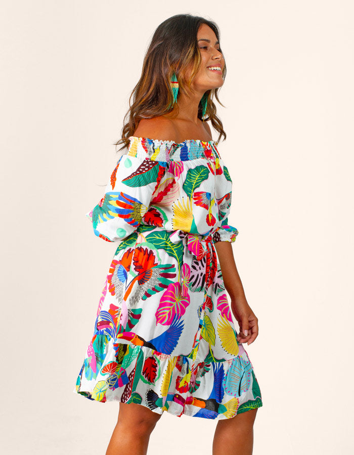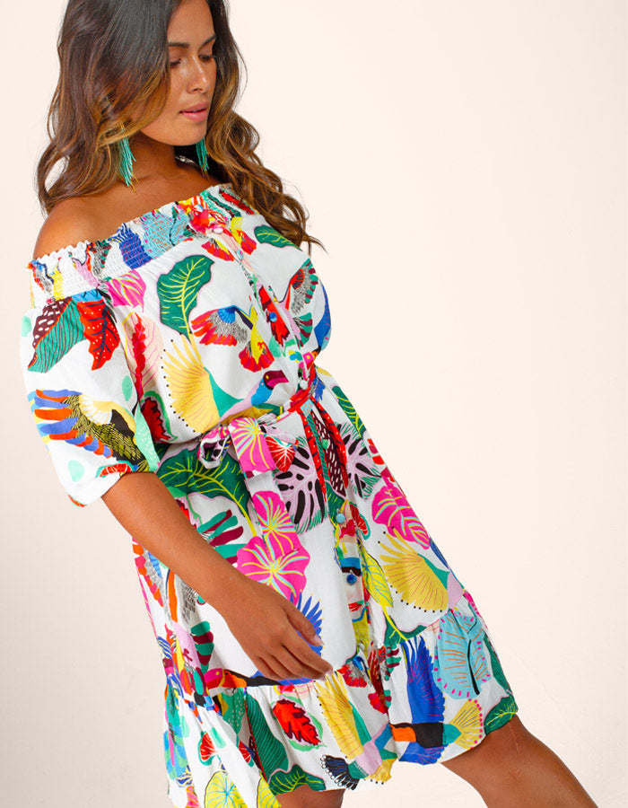 Get ready to turn heads in our latest Short Dress! With shirred shoulders and a flirty off-shoulder design, this dress exudes femininity and elegance. The covered button at the front adds a touch of sophistication, making it perfect for any occasion.