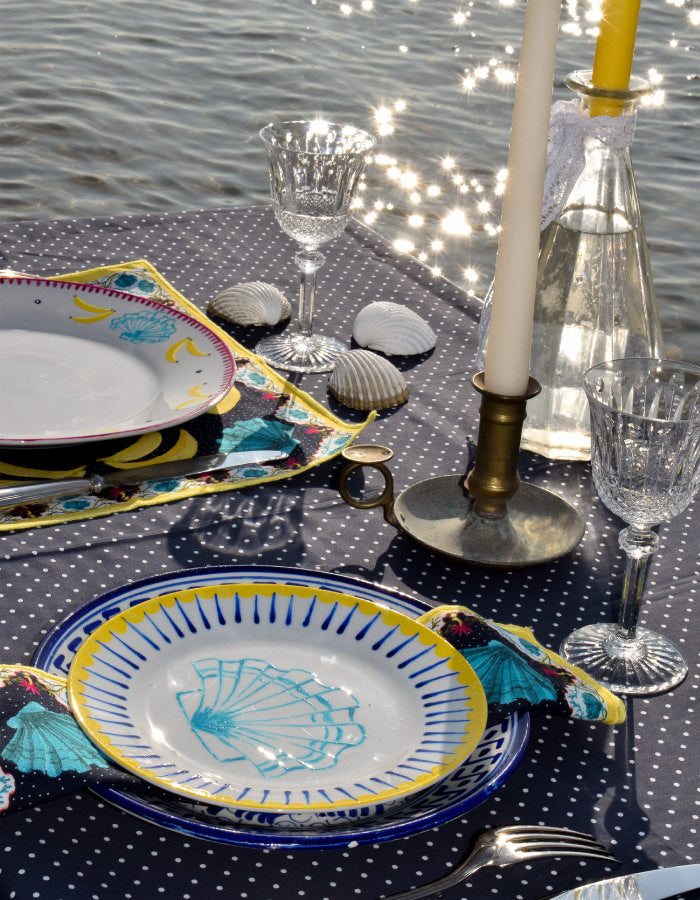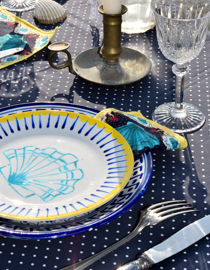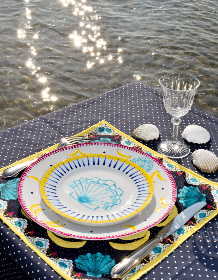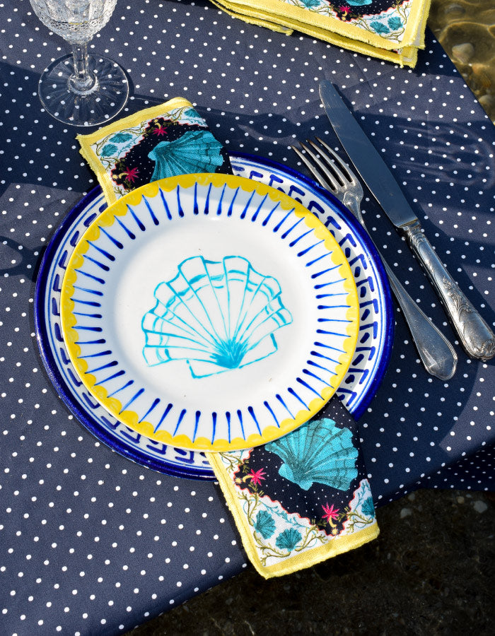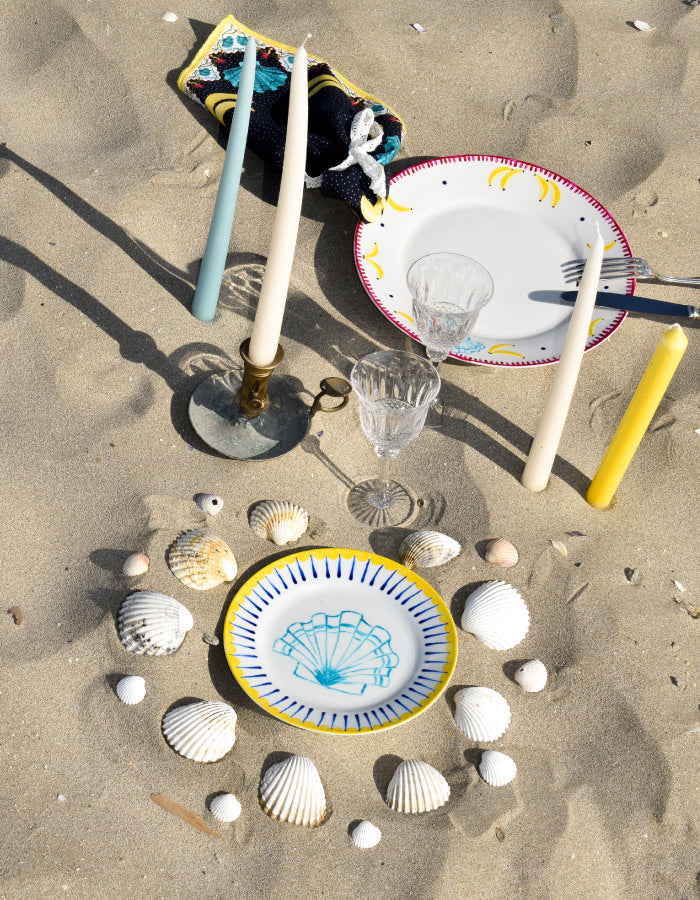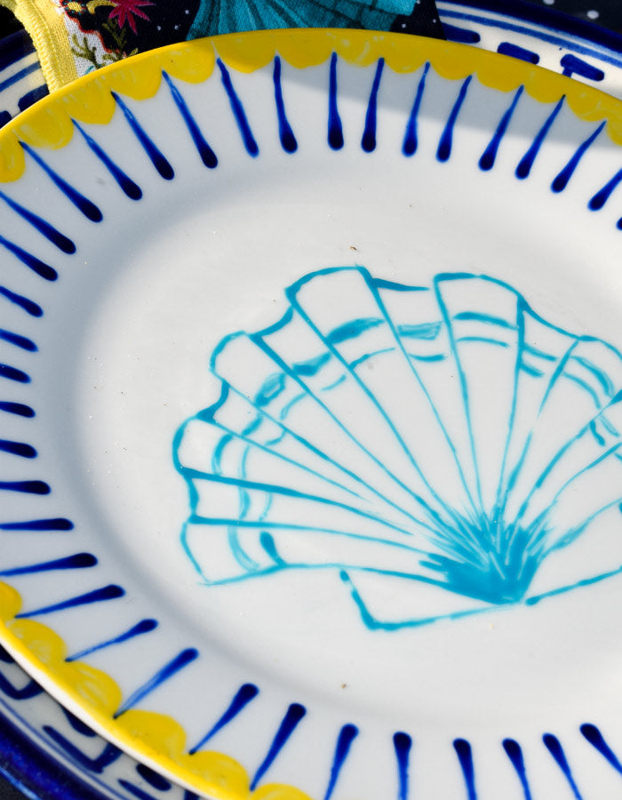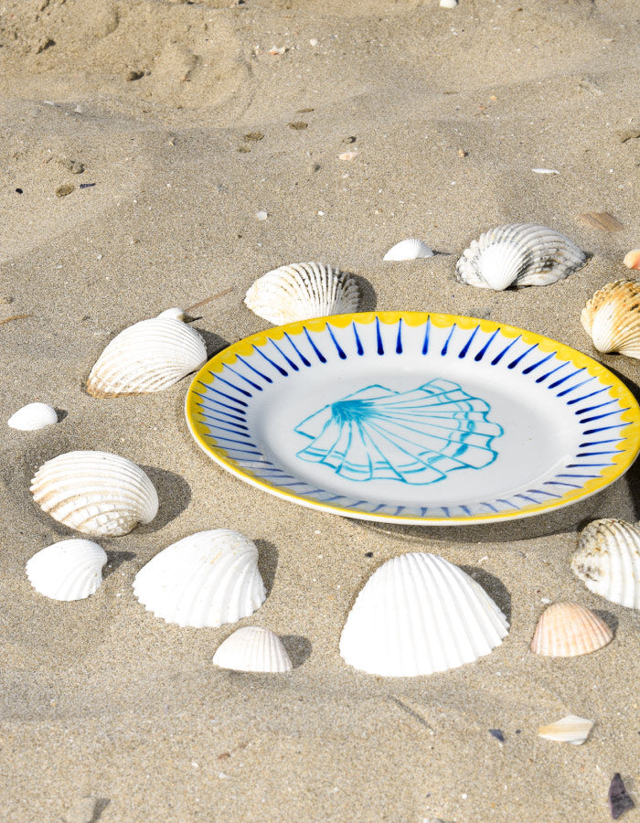 Break away from the ordinary with this daring hand-painted ceramic plate featuring a large, striking turquoise shell at its center. Surrounded by a bold graphic striped border, its 23 cm size makes it the perfect companion for a summer picnic on the sand, adding vibrant energy to every outdoor meal.