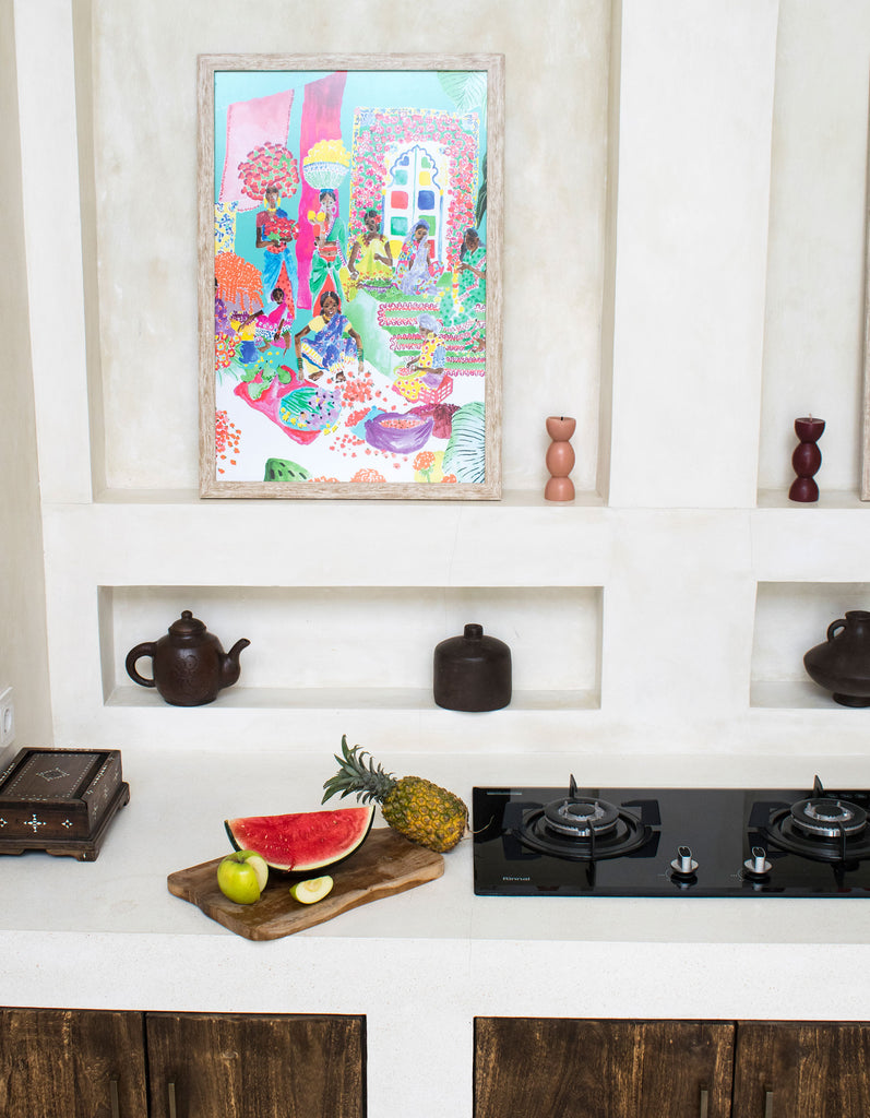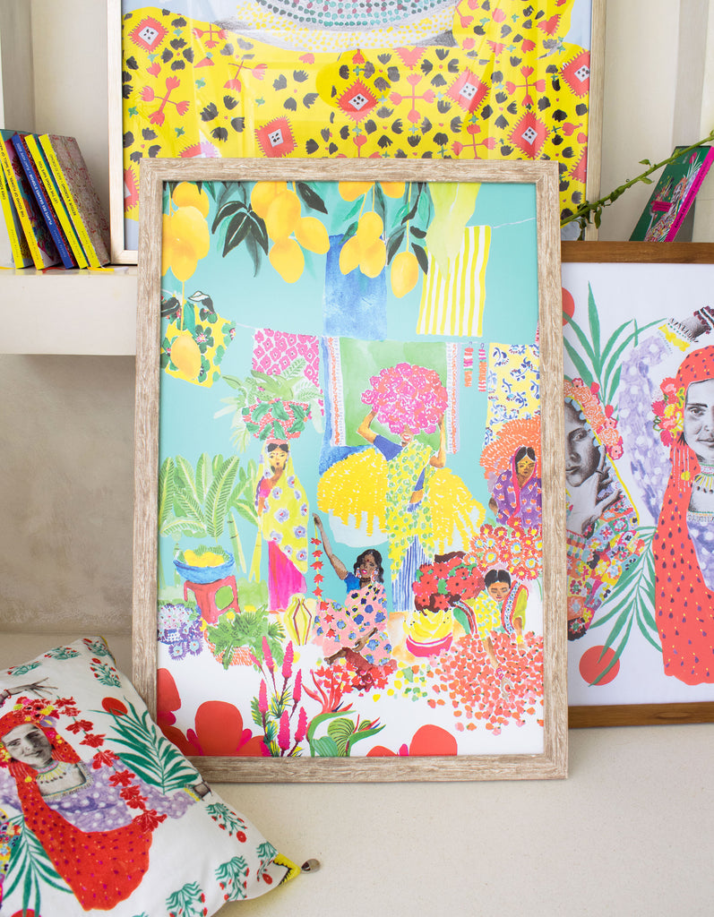 When you’re there, you swear by the colourful sarees, the fragrance of flowers and a spectacle forever in motion. With this hand-painted illustration, the exoticism comes out of nowhere. Winter and autumn are forgotten. In Nagpur, Indian women bargain for flowers, incense and ingredients: freshly picked curry leaves, tamarind paste and juicy mangoes.