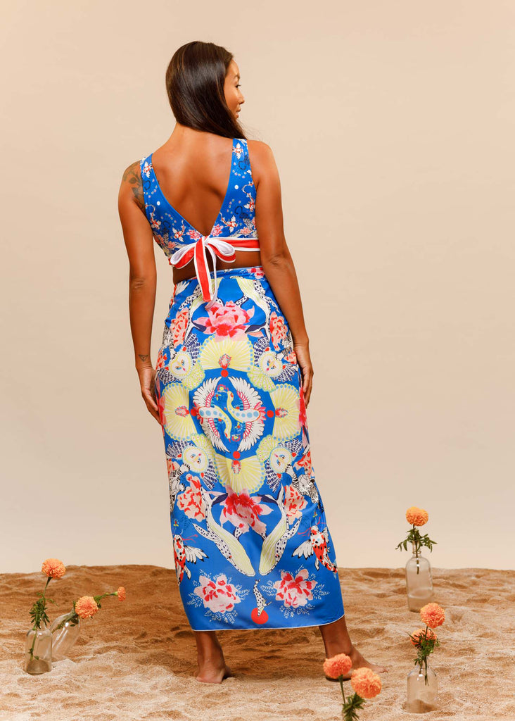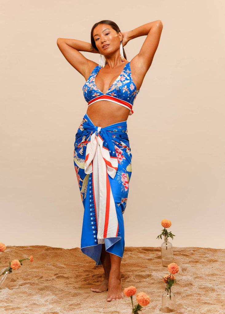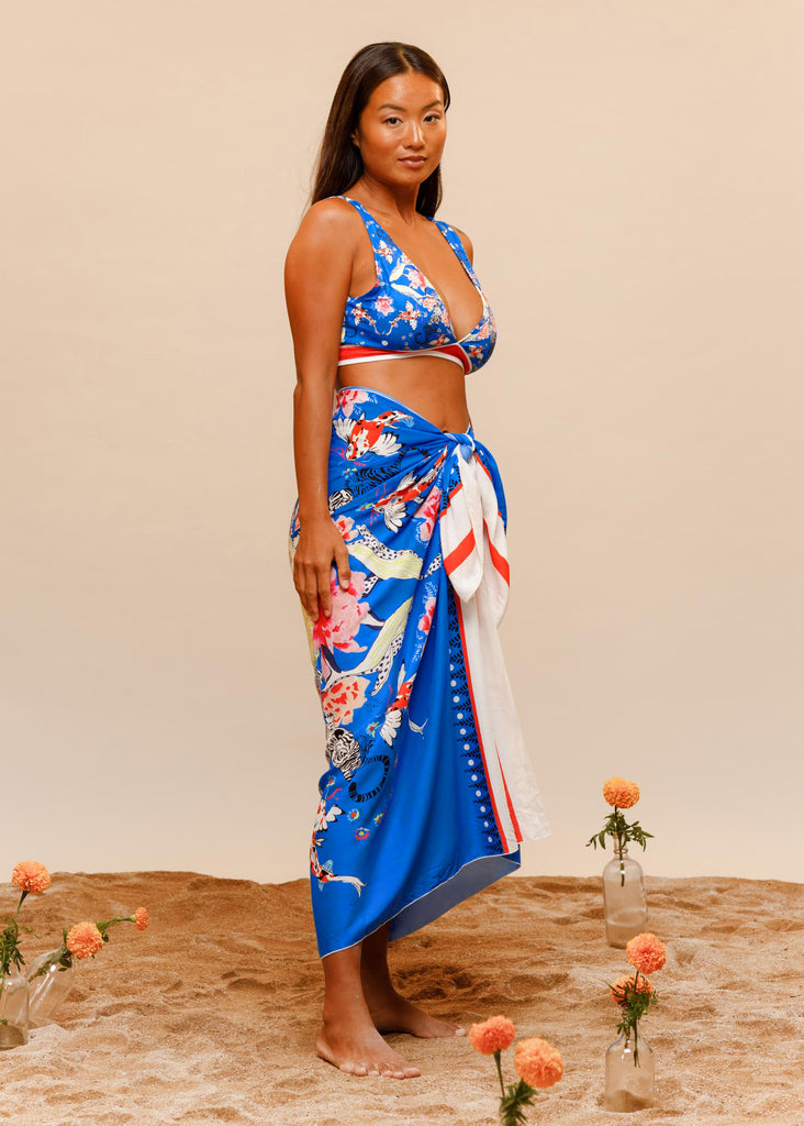 Nori Sarong has hand-painted printed illustration and is an authentic piece of art. The combination of vibrant colors and ethnic inspirations show that we can use it for beachwear and home decor. Framed, as a tablecloth or bedspread, the sarong brings a real bohemian atmosphere under the sign of faraway places.