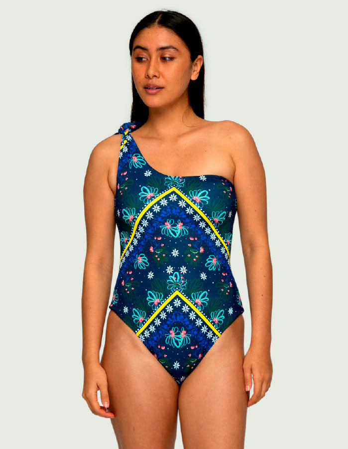 Beautify and shape your silhouette with the Rajani asymmetrical one-piece. The top part fits the curvy shape of your bust beautifully, and the bottom is slightly cut out to slim your legs. The Rajani One Shoulder doesn’t tend to slip as it has integrated elastics all around the neckline.