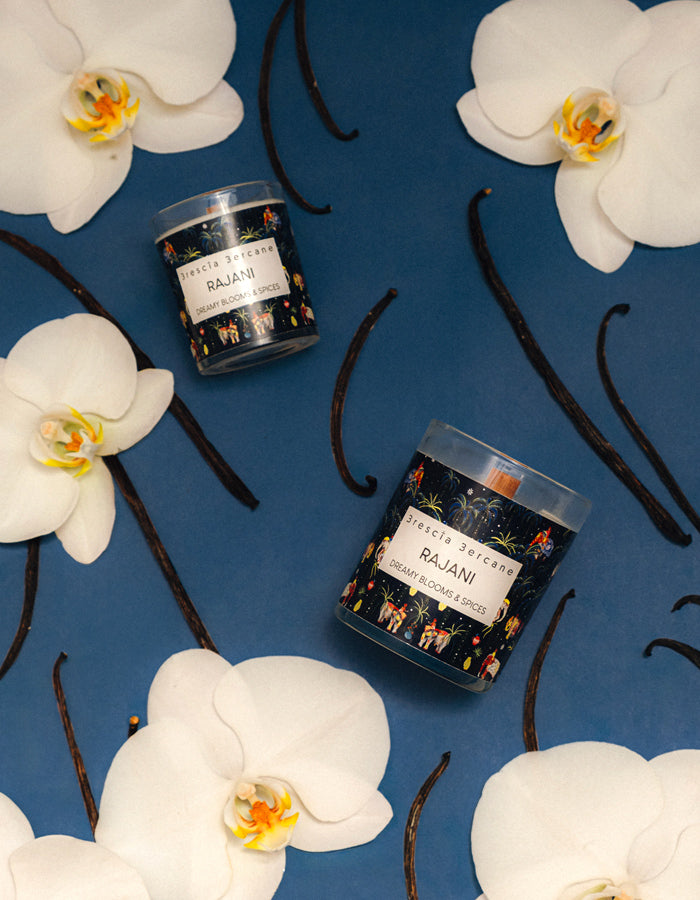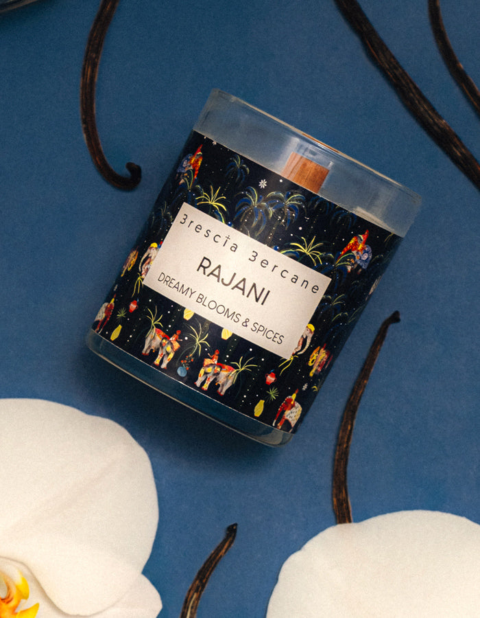 Introducing the Rajani Candle - experience the magic of starry nights and Indian festivities with the mystical scent of cinnamon and sweet oranges. Bring a touch of enchantment to your home and delight your senses with this unique and aromatic candle.
