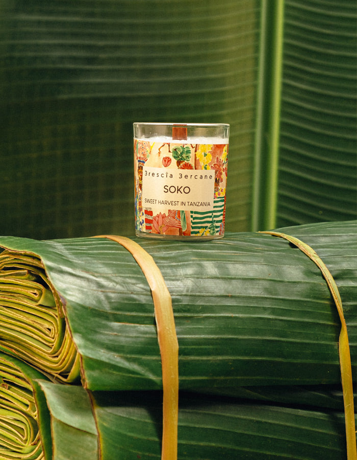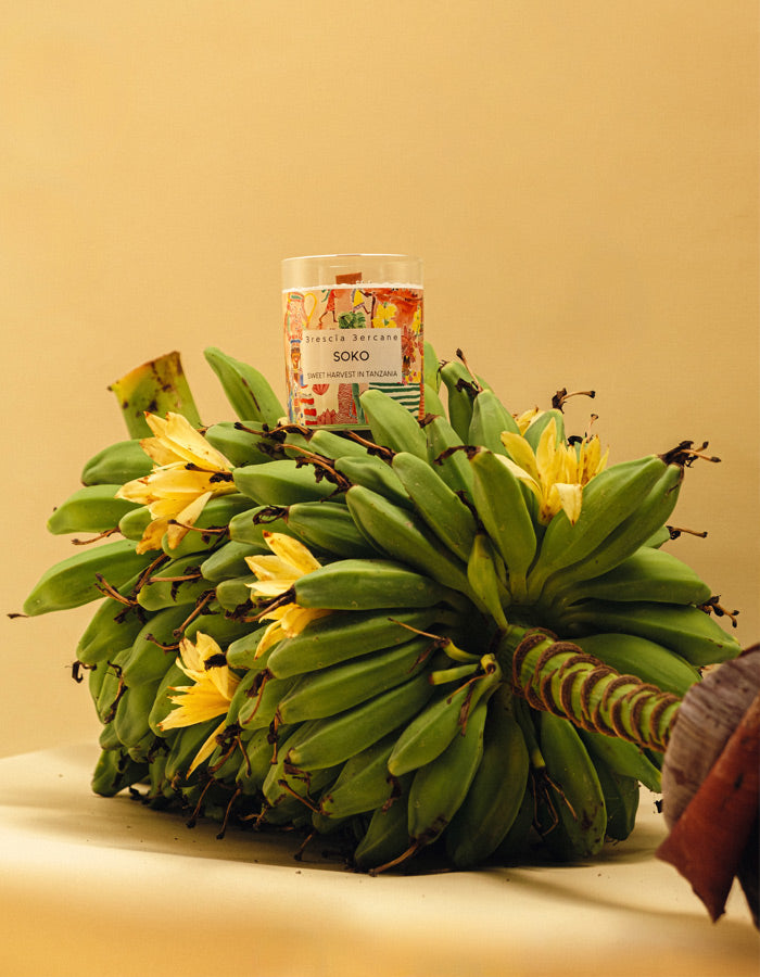 Set the mood with Soko Candle, inspired by the vibrant colors and earthy warmth of Tanzania's markets. With scents of fresh fruits, rich red earth and yellow/white flowers, you'll feel like you're strolling through a lively African market. Lighten up your space and indulge in this playful experience.