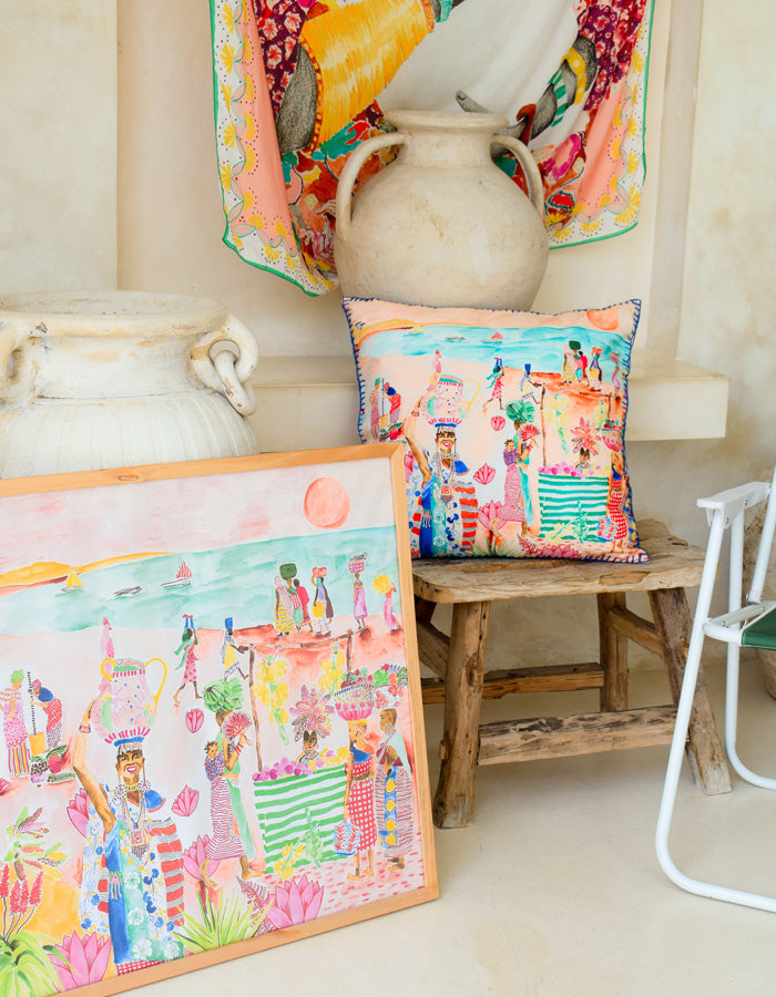 Soko (‘market’ in Swahili) is a symphony of colours and flavours, where the sun gently caresses the red earth of Tanzania. Under a dusky sky, the Maasai unfurl their red tartan cloths, adding a vibrant palette of colour to the lively scene. Women proudly carrying babies on their backs gracefully balance bunches of bananas on their heads, while a vendor carrying golden maize on her head presents a display of local fruits. In this watercolour painting, full of life and movement, each figure radiates joy.